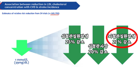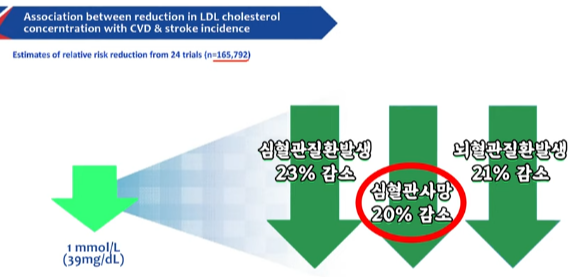 여기 바로 고지혈증이 좋아졌을 때 얼마나 심혈관 사건 사망이 줄었는지에 대한 보고가 있습니다. 165,792명을 대상으로 한 결과이고, LDL(저밀도 콜레스테롤)이라는 나쁜 콜레스테롤 수치가 39mg/dl 가 감소했을 때 심혈관 질환 발생은 23%가 감소하고, 심혈관 사망률은 20%, 뇌졸중은 21% 감소했다는 결과가 있습니다. 이것도 또 25개 임상 연구들을 조합해서 분석한 결과인데, 마찬가지로 LDL이 39% 감소했을 때 심혈관 사망률은 20%, 뇌졸중 사망률은 14% 감소했다는 결과가 있습니다.