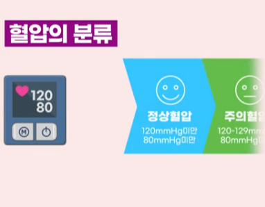 수축기 혈압이 120 미만이거나 이완기 혈압이 80 미만인 경우 정상혈압 범위에 해당합니다. 혈압이 정상보다는 높고 고혈압 기준보다는 낮은 경우는 주의혈압과 고혈압 전단계로 분류합니다. 고혈압으로 진행될 가능성이 높으므로 생활 습관을 조절하고 혈액을 관리하는 것이 중요합니다. 수축기 혈압이 140 이상이거나 이완기 혈압이 90 이상이면 고혈압으로 진단하게 되며 고혈압도 1기와 2기로 나뉘어 분류에 따라 치료 방법을 결정하게 됩니다.